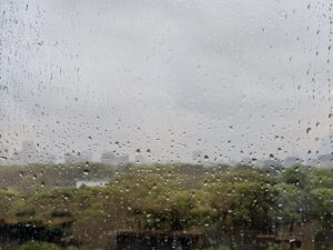 雨。窓ガラスに雨しずくがつくくらいの雨です。